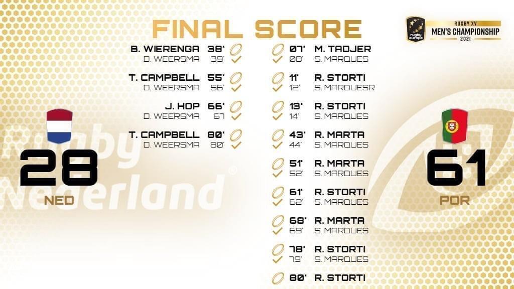 1. Francisco Fernandes (16. David Costa, 62’), 2. Mike Tadjer, 1E (8'), (17. Duarte Diniz, 71’), 3. Anthony Alves (18. Diogo Hasse Ferreira, 55’); 4. José Madeira, 5. Jean Sousa (19. José Rebelo Andrade, 71’) ; 6. João Granate, 7. Rafael Simões, 8. Thibault Freitas (20. Manuel Picão, 66’); 9. Samuel Marques, 8T (8', 12', 13', 40', 51', 61', 68', 77'), (21. Pedro Lucas, 78'), 10. Jerónimo Portela;11. Rodrigo Marta, 3E (40',51'68'), 12. Tomás Appleton (cap.), 13. José Lima (23. Pedro Bettencourt, 66’) 14. Raffaele Storti, 5E (12', 13', 61', 77', 79') , 15. Nuno Sousa Guedes (22. Manuel Cardoso Pinto, 69’).