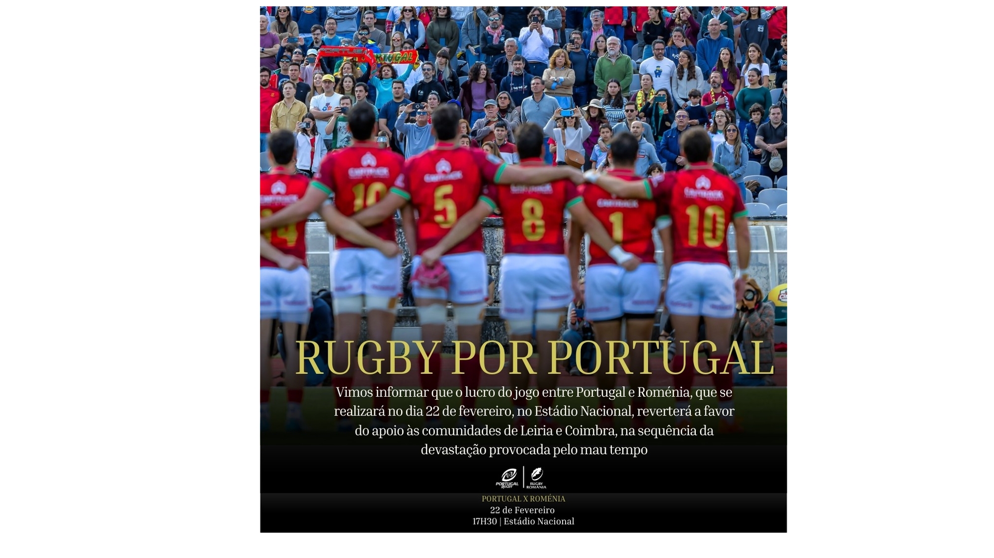 Mas, desta vez, há algo maior do que o próprio jogo. O rugby tem sentido sempre o carinho dos portugueses e chegou o momento de retribuir. A Federação Portuguesa de Rugby informa que a receita da bilheteira deste encontro será revertido para apoiar as comunidades de Leiria e Coimbra, severamente afetadas pelas tempestades que atingiram o país.