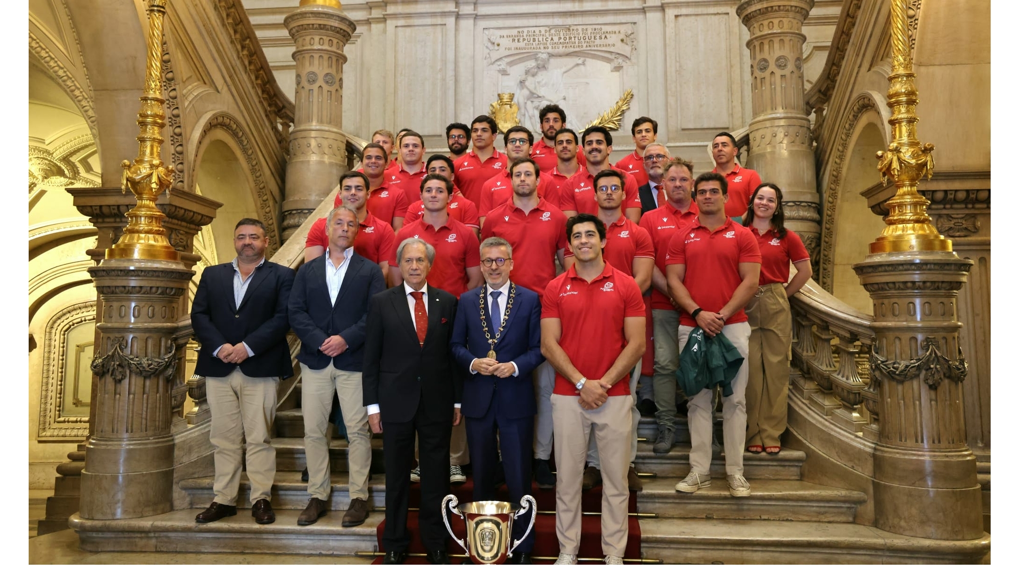 A Seleção Nacional masculina de Rugby foi hoje recebida na Câmara Municipal de Lisboa pelo seu presidente, Eng.º Carlos Moedas, numa cerimónia de homenagem que assinalou a conquista do Rugby Europe Championship 2026.